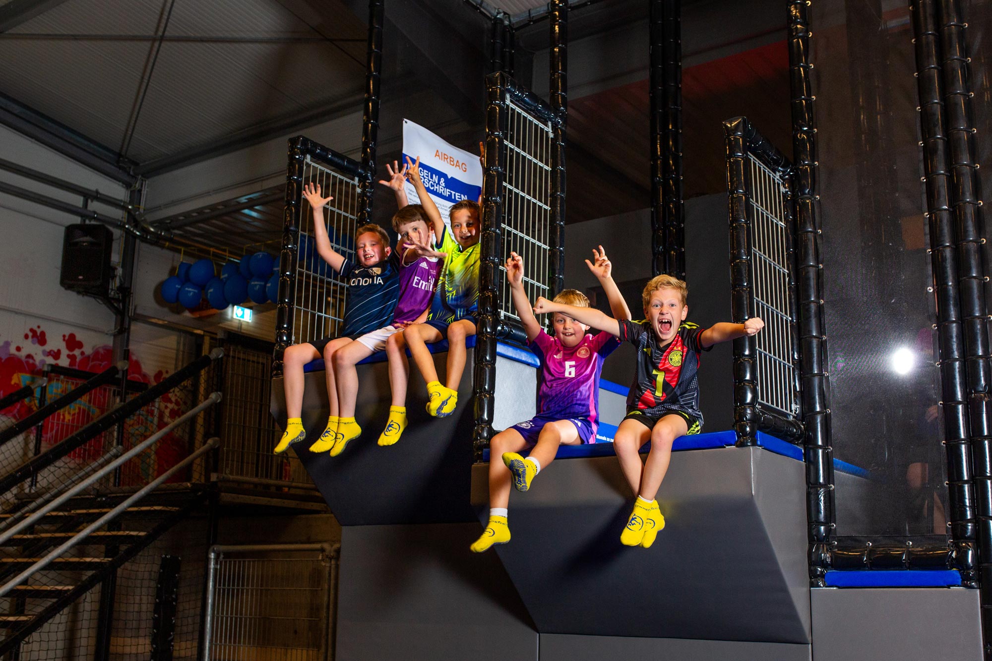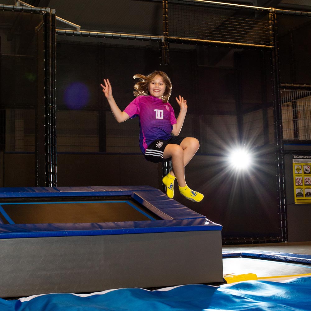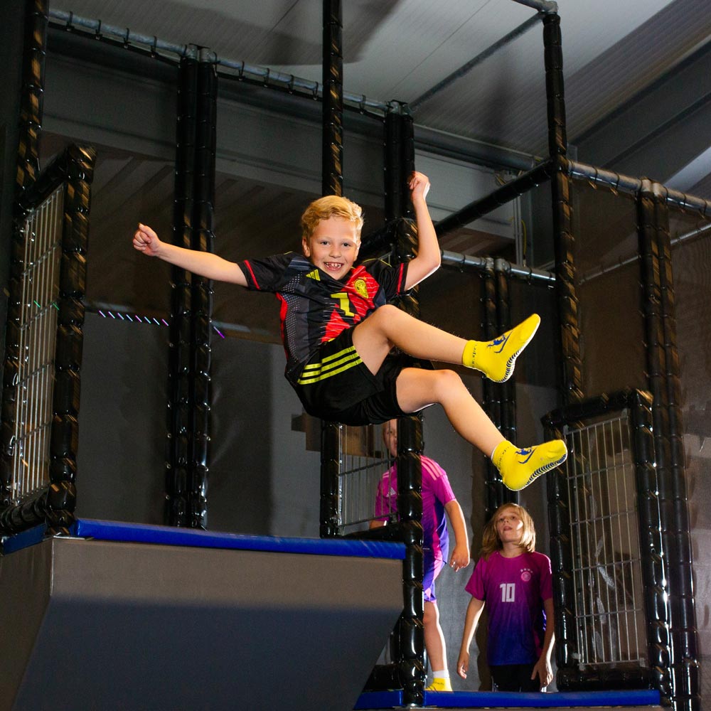 Aus Sicherheitsgründen sind unsere rutschfesten Socken auf der Trampolinfläche Pflicht.